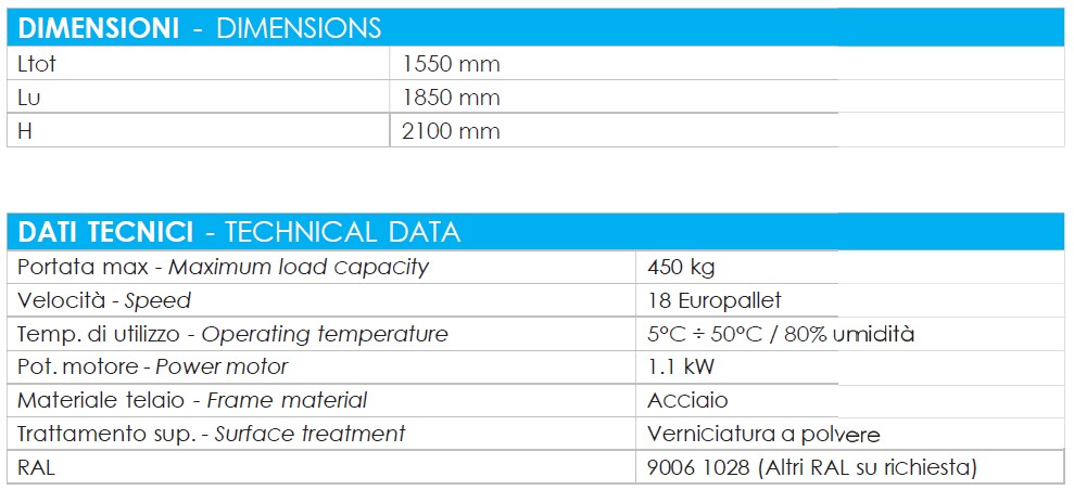 Il movimento verticale avviene grazie ad un motore elettrico. Il prodotto dispone di piedi zincati tassellabili meccanicamente al terreno e la struttura è costruita in carpenteria saldata. In totale è possibile stoccare 18 Europallet.