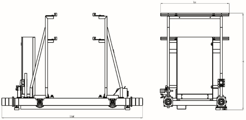 La sua struttura è tipicamente in carpenteria saldata ed è dotata di ruote in acciaio con riporto in vulkollan che scorrono su rotaie in acciaio zincato.