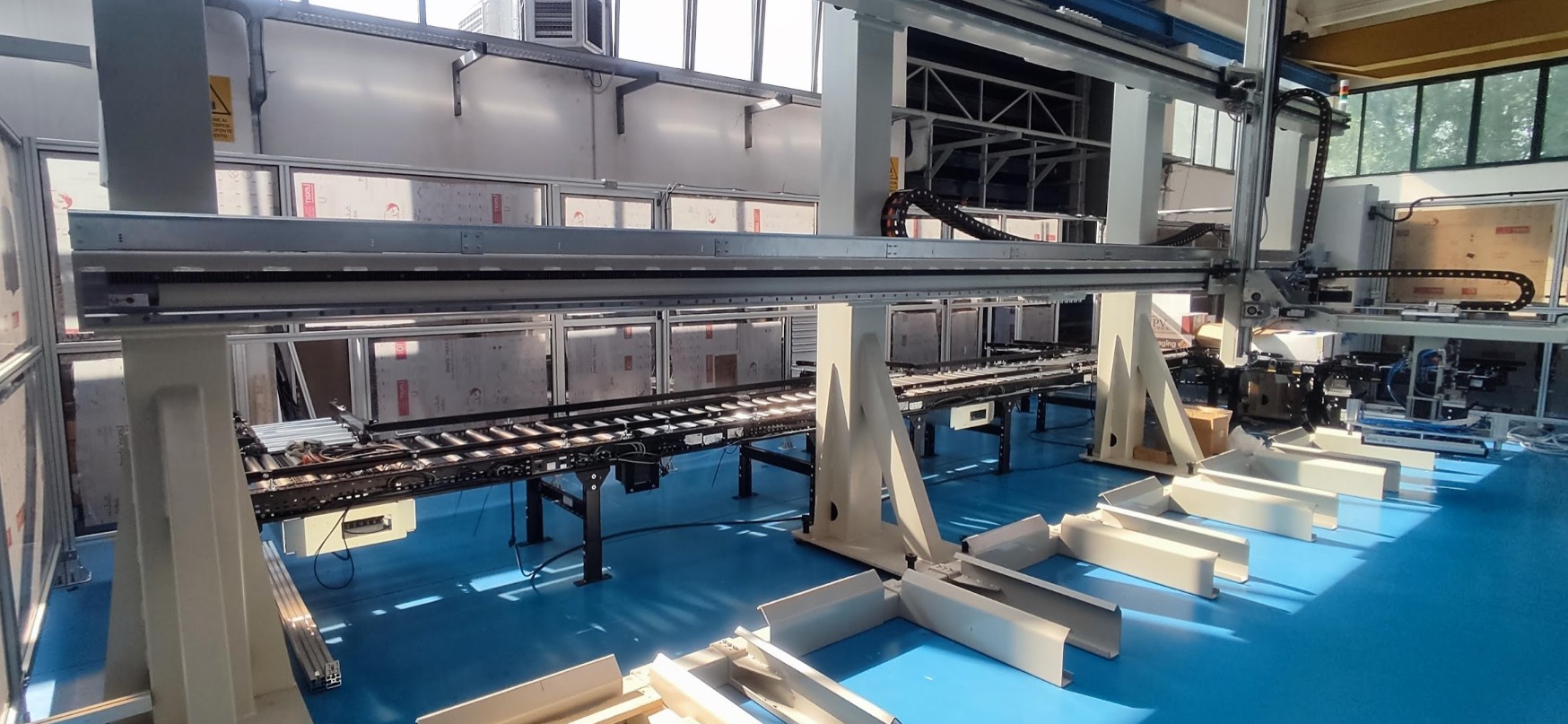 Il sistema è in grado di asservire 5 linee di produzione; i colli, di diversa misura, vengono identificati mediante lettura del codice a barre, vengono successivamente pesati e posizionati sul pallet di competenza, secondo geometrie variabili definite dall’operatore